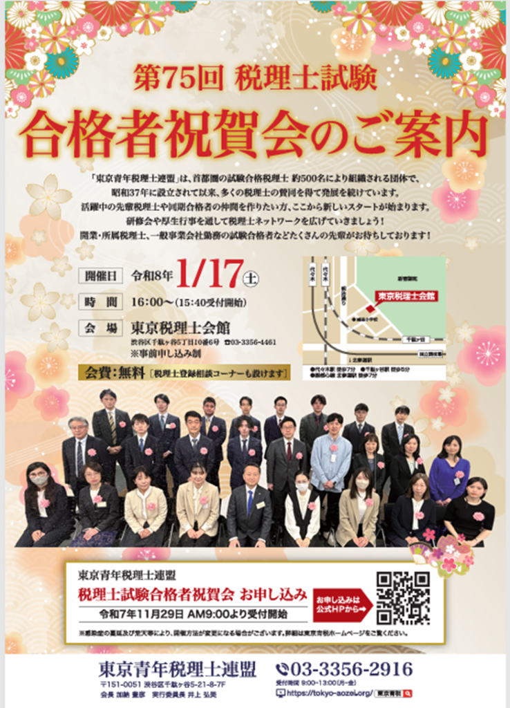 東京青年税理士連盟では希望に燃える新合格者を迎え、皆さんの税理士試験合格をお祝いするとともに東京青税の魅力をより多く知っていただけるよう、合格者祝賀会を下記の要領で開催いたします。沢山の先輩、合格した仲間との交流を持つ機会としてぜひご利用ください。当日は開業税理士による税理士登録の相談ブースも設けます。